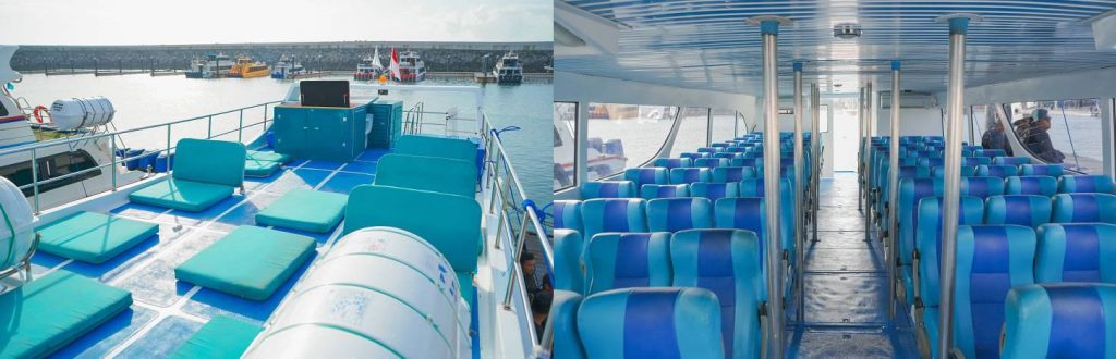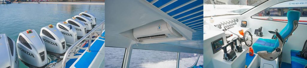 | – Lenght Over All: 20.50 meters – Bread: 5.00 meters – Depth: 1.60 meter | – Main Engine : HONDA, 7 X 250 HP – Maximum speed : 29 knots – Cruising speed : 25 knots | – Crew : 5 – Captain : 1 – Passenger : 100 persons |